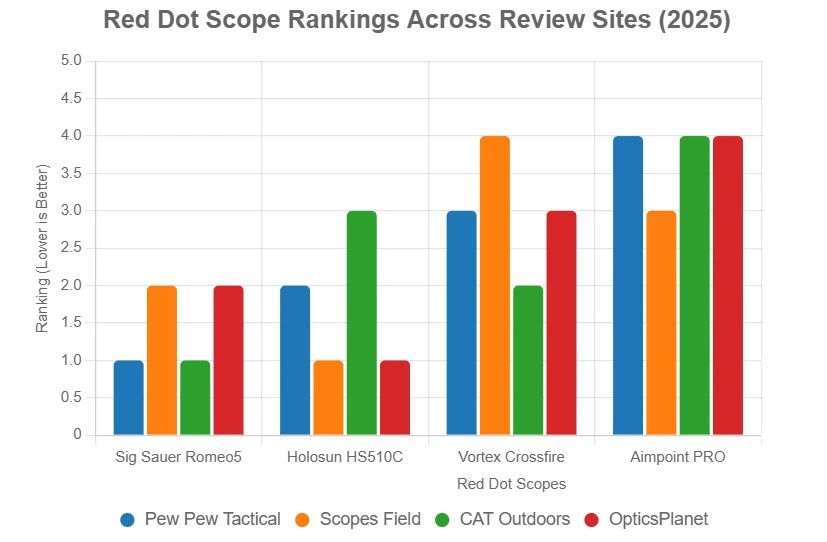 Here’s how the top red dot scopes stacked up across review sites. The table shows their rankings on each site, with the average determining their overall position.