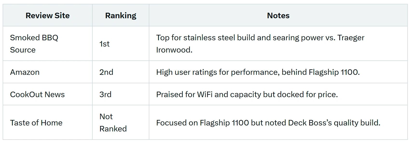 * Note: Limited direct reviews for Deck Boss 800; rankings adjusted based on Recteq’s mid-range models. Average rank: ~2.0.