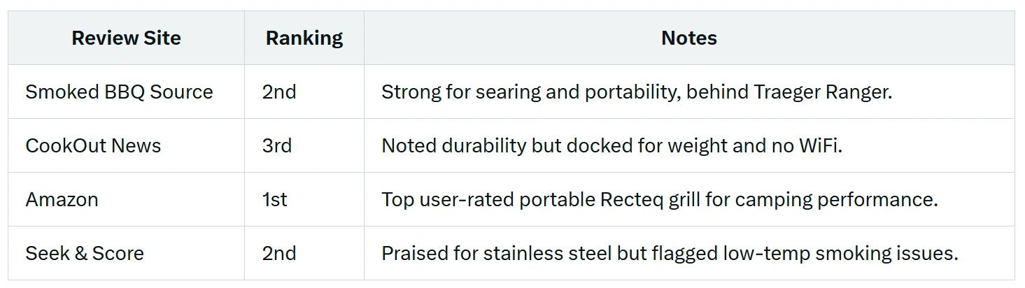 *Note: Rankings reflect portable pellet grill lists. Average rank: ~2.0.