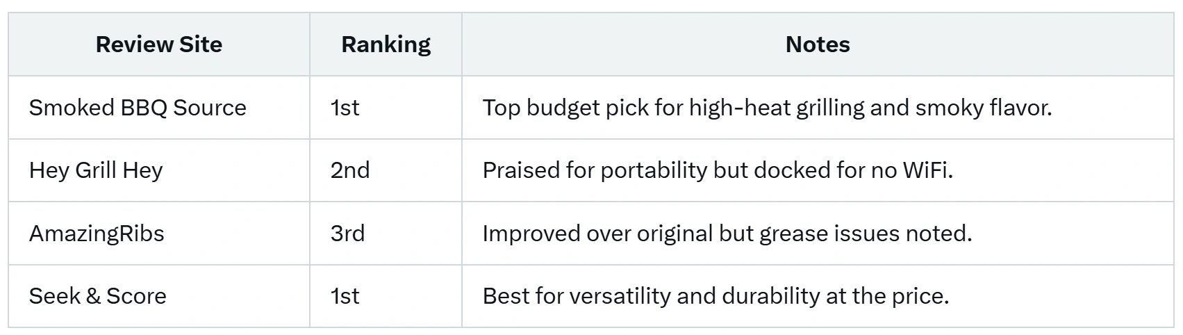 *Note: Rankings reflect budget pellet grill lists or Bullseye-specific reviews. Average rank: ~1.75.